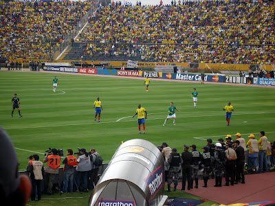 We learned some popular chants from a nearby crowd of enthusiastic fans. Some of the transations were roughly: "You can do it!", "Stand up, Ecuador!", "Let's go Ecuadorians, it's your mission, we have to win!", and of course "ECUADOR! ECUADOR! ECUADOR!". These same spirited ecuadorians sitting near us were also really good at starting the wave, which we were able to make go around the whole stadium seve